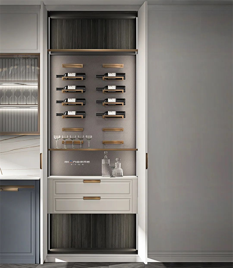 「阿丽亚」系列酒柜特殊的几何布纹肌理背板,增加柔软舒适度,可以自由排列的酒瓶架,结合斜切金属板,让产品呈现轻薄和立体感,为生活增添DIY的乐趣。