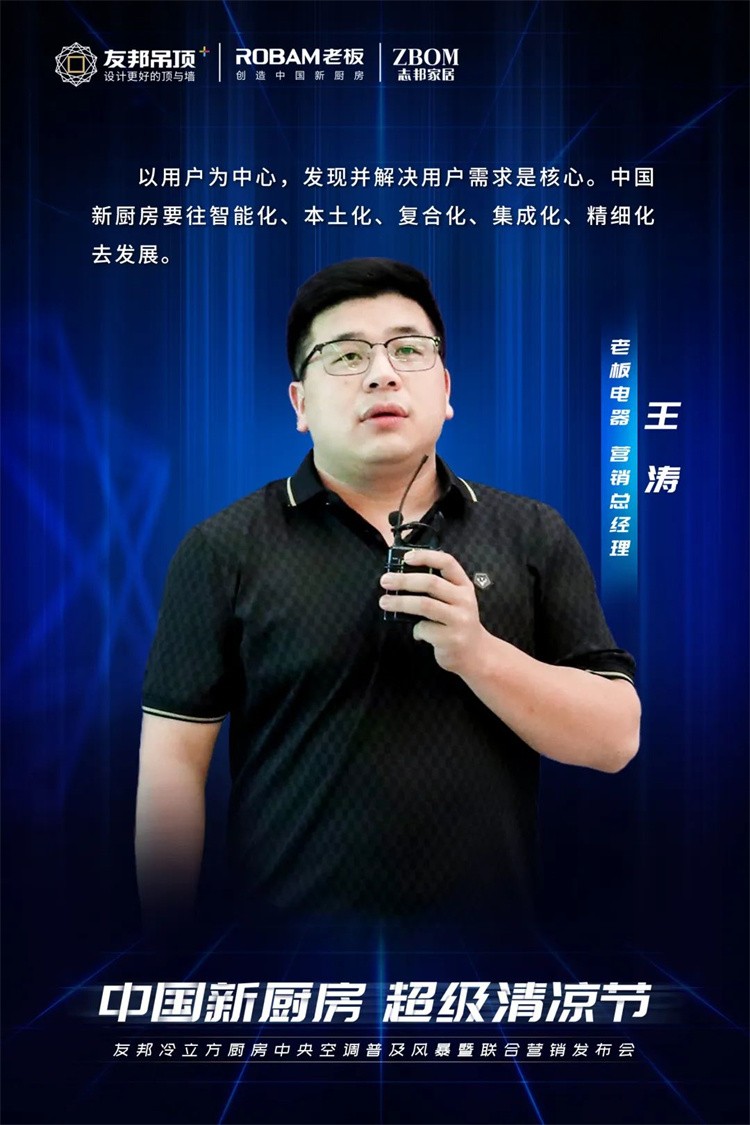 友邦用户与产品中心总监周邦杰先生提出:要满足消费者对理想厨房生活的需求,我们必须要解决环境、烹饪和收纳的问题。烹饪和收纳两个方面,老板电器及志邦家居,给出了非常完美的解决方案。而好的厨房环境,应该是空气新鲜、温度适宜,顶、墙、柜、厨房电器和空间整体搭配协调的。为解决烹饪环境方案,友邦推出了冷立方厨房中央空调C5及尚5健康大板,让烹饪环境更舒适,营造更高端、更有格调的厨房空间。本次发布会推出的冷立方厨房中央空调,该产品的一大亮点便是“可拆洗,才冷净”。其独具大1.5匹强劲制冷功率,磁吸式可拆洗滤网,535mm超长风幕等优势,是友邦坚持“产品领先用户之上”的表现。满足用户更舒适烹饪环境的需求,提升家庭幸福感。
