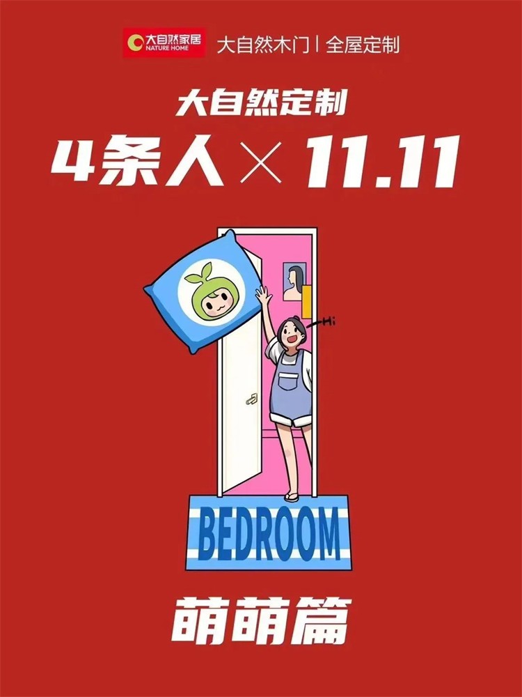 大自然木门丨全屋定制方面,则创意十足地打造了萌萌篇、玫瑰篇、阿强篇、小金篇以及终极番外篇的“4条人×11.11”1年1度1次1折的主题篇短视频合集,直剖消费者的购物动机,精准透视了精打细算型买手和弃旧换新高颜追求者的消费洞察;同时,真实揭示了拼手速才能抢到优惠、买买买扛扛扛非一站式购齐的所谓大促消费痛点,简单粗暴地打出1折起的明码实价优惠,让“大自然木门丨全屋定制真的很惠”跃然幕前,门墙柜一体化,任君选购。