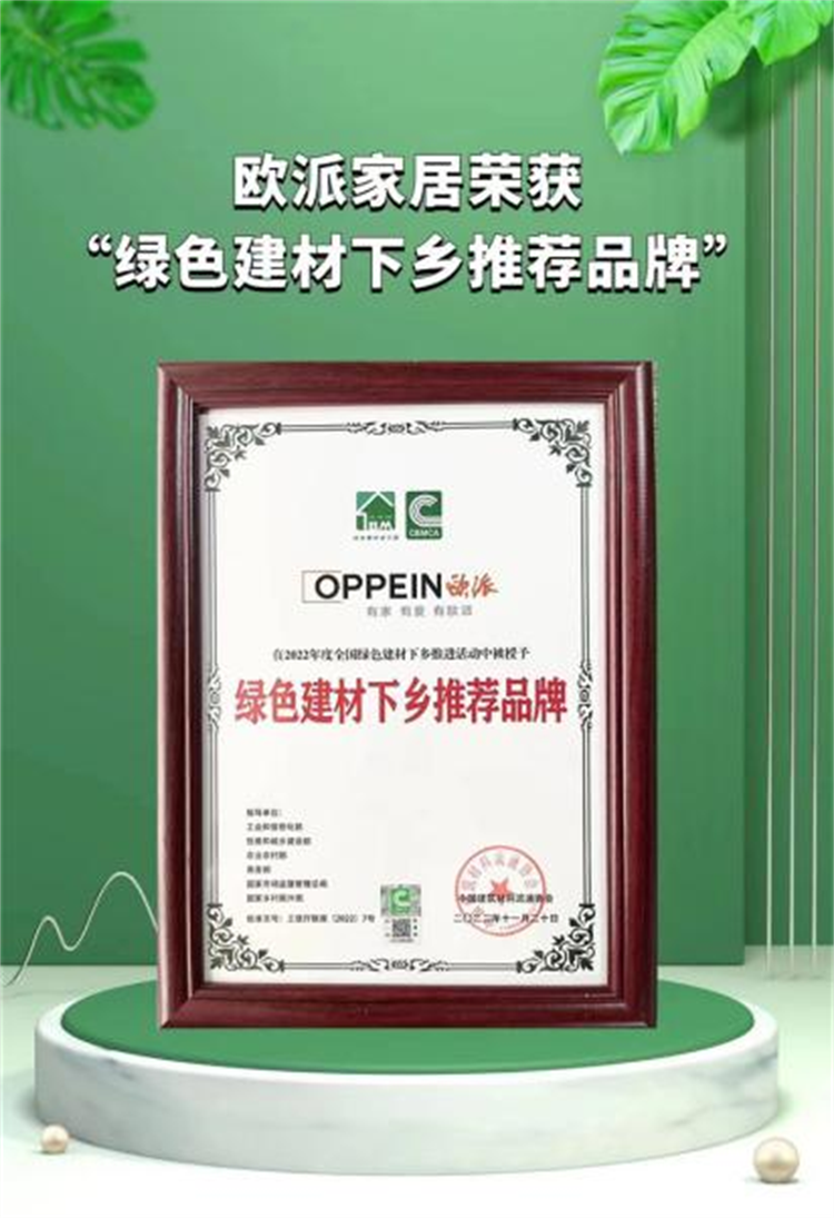 近日,以“绿色家居进万家健康普惠中国行”为主题的2023欧派健康+3.0战略发布会暨【健康普惠中国行】启动仪式在欧派总部圆满举办。会上,欧派家居荣获由中国建筑材料流通协会颁发的“绿色建材下乡推荐品牌”奖项。
