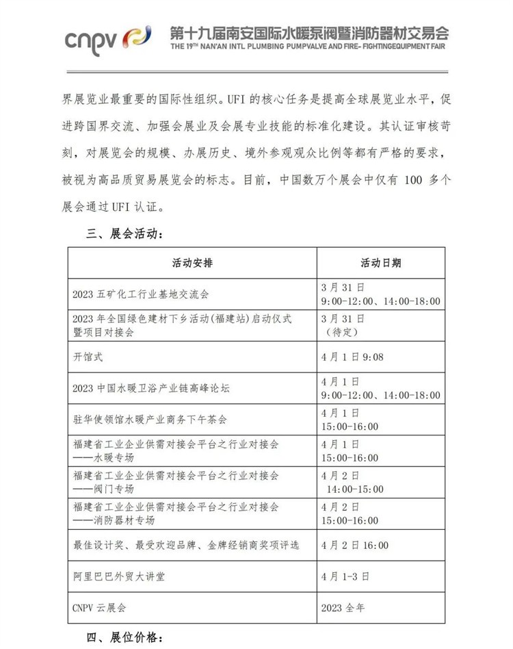 CNPV将于2023年4月1日—3日在南安·福建成功国际会展中心盛大召开。以“供需对接·产业赋能”为主题,系列活动共10项,展区规划展示面积达25000平方米,展位数1100个,共有五个展示区,分别为:(一)水暖洁具精品展示区:水暖、卫浴、五金、仪表产品系列等相关产品。(二)泵阀展示区:阀门类、泵类、各类材料管材管件类等产品。(三)消防器材展示区:灭火器、消火栓(箱)、消防栓(箱)、等消防器材及消防配件产品。(四)铜阀门展示区:铜闸门、铜球阀、铜截止阀、铜止回阀等。(五)绿色建材产品展示区:卫生洁具、建筑陶瓷、防水涂料、石材、砌体材料等。