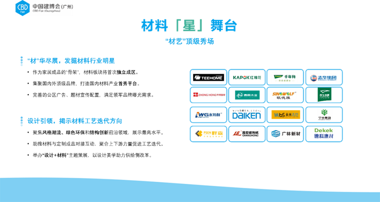 2023年,中国建博会(广州)顺应大家居建装供应链的创新引领趋势,在广交会展馆C区新设立以“材料”和“工艺”为展示核心要素的“材艺”主题展区,充分发挥大家居建装行业供应链各题材的聚集效应,开辟新领域,制胜新赛道。