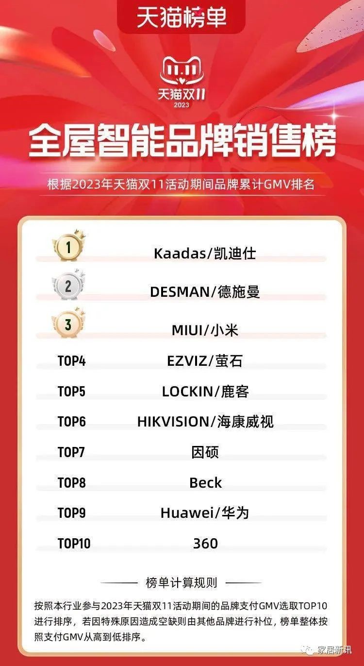 此外,天猫发布全周期榜单,各个行业的领跑品牌、商家出炉。以下为2023年天猫双11全周期(10月31日-11月11日)家居建材类榜单:
