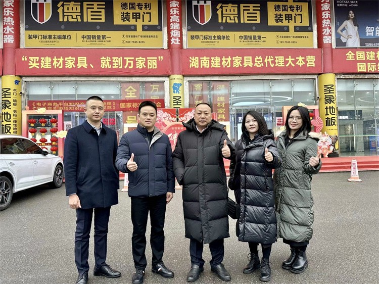 ▲中国建筑材料流通协会执行副会长兼陶瓷卫浴经销商委员会主席李作奇(左三)、整装定制与门窗幕墙委员会主席周时珍(右二)、秘书长陈艳霞(右一)、万家丽家居建材广场&家居生活广场总经理徐向福(左二)、招商总监杨峰(左一)