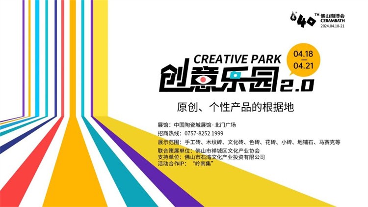 创意乐园位于中国陶瓷城展馆·北门广场,富涵原创、个性等特色产品,与佛山陶博会创意风潮撞个满怀!这里汇聚了LESSISX纳思科斯、一点白白砖、凯萨洛亚、FMAX、杜拉拉、哥德艺典、家鹏石材、火炬、狮王、希睿、摩达、爱佳、Q-STONE等优质品牌,主要展示手工砖、木纹砖、色砖、花砖、小砖、地铺石、马赛克等产品。