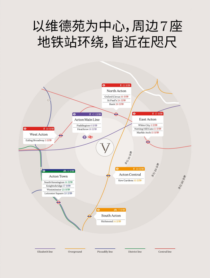 从维德苑启程,仅需步行约2.2公里,即可抵达皮卡迪利线与区域线交汇的ActonTown站,这里可以轻松抵达南肯辛顿(SouthKensington)、骑士桥(Knightsbridge)、威斯敏斯特(Westminster)和莱斯特广场(LeicesterSquare)等多个伦敦标志性地点;中央线与维德苑的联系更加紧密,有3个站点紧靠维德苑,其中NorthActon站只需步行1公里即可抵达;距离最近的伊丽莎白线更是让伦敦市中心和国际门户都变得触手可及,从维德苑出发只需步行不到1分钟,便可以踏上的伊丽莎白线,6分钟即可去到帕丁顿(Paddington),18分钟可抵达希思罗机场。