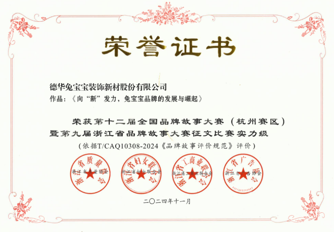 在第十二届全国品牌故事大赛(杭州赛区)暨第九届浙江省品牌故事大赛中,兔宝宝参赛作品《向“新”发力,兔宝宝品牌的发展与崛起》和《兔宝宝让家更好》分别在征文比赛和短视频比赛中获评“实力级作品。本届全国品牌故事大赛以“发展新质生产力,释放品牌新势能”为主题,旨在宣传展示中国企业全面贯彻新发展理念、坚持高质量可持续发展、发挥品牌引领作用的经验和故事,搭建中国企业品牌交流平台,共享品牌成果、共塑品牌价值。