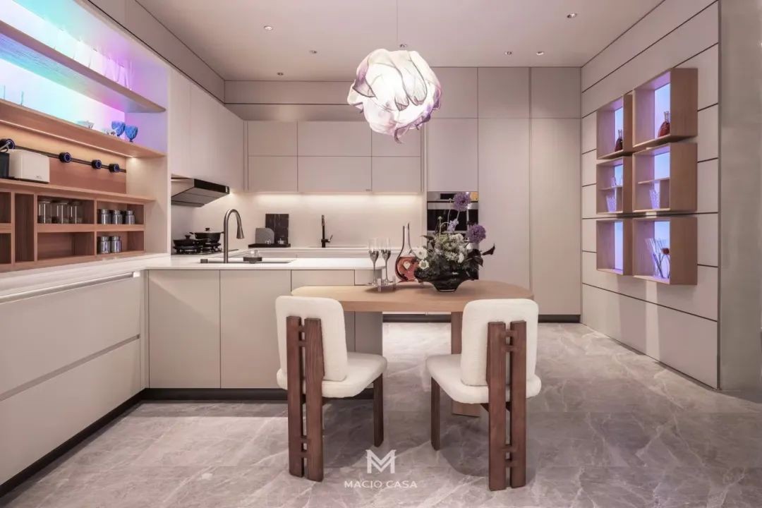 玛菓整装区聚焦厨房与衣帽间,以精致设计强化互动体验,通过多功能空间划分实现社交与实用并重,整体空间平衡现代简约与艺术氛围,缔造兼具高端格调与舒适体验的家居场域。