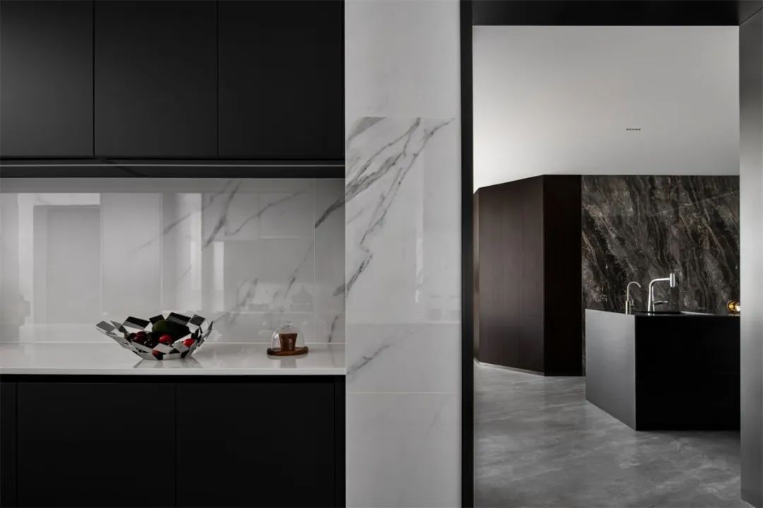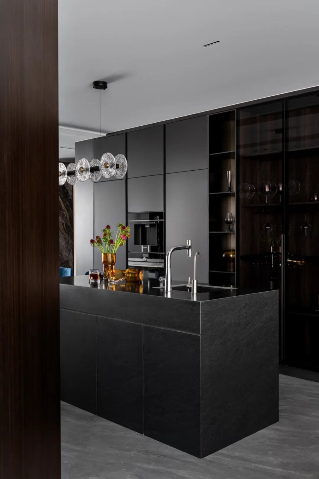 开放式厨房与餐厅一体化空间。以简洁的黑、灰为主色调,通过开放式布局融合烹饪、用餐功能,营造出流畅互动的生活场景。