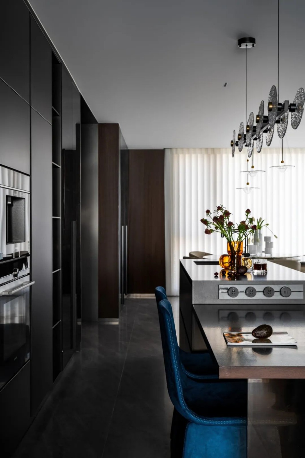 岛台与中厨紧密相连,流畅的动线设计,实现烹饪与备餐的高效互动,岛台延展出的餐桌与圆形餐桌并置,营造出一个功能完备且极具生活质感的餐厅空间。