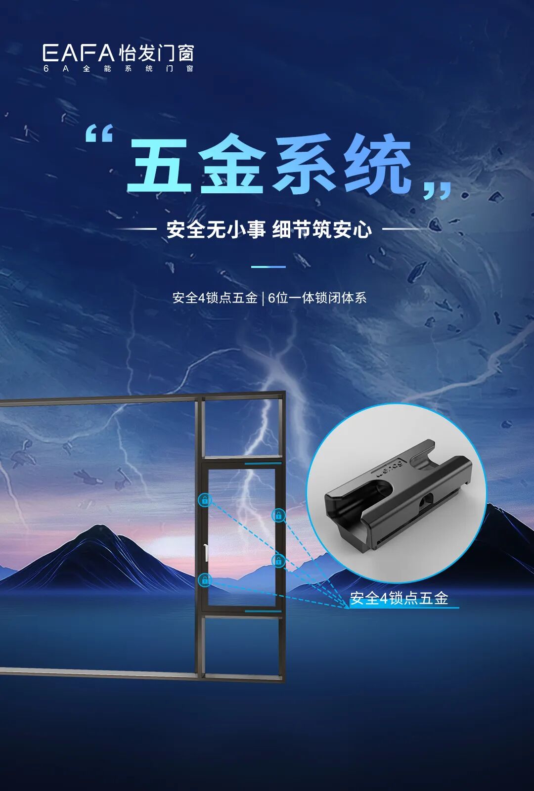 配备4锁点与防坠绳双重防护,4锁点均匀分布,多向锁紧窗户,防坠绳作额外保障,给窗扇第二层保护。同时,6位一体锁闭体系将多锁点有机结合,形成严密防护,能全方位抵御台风的冲击,让居家更安全。