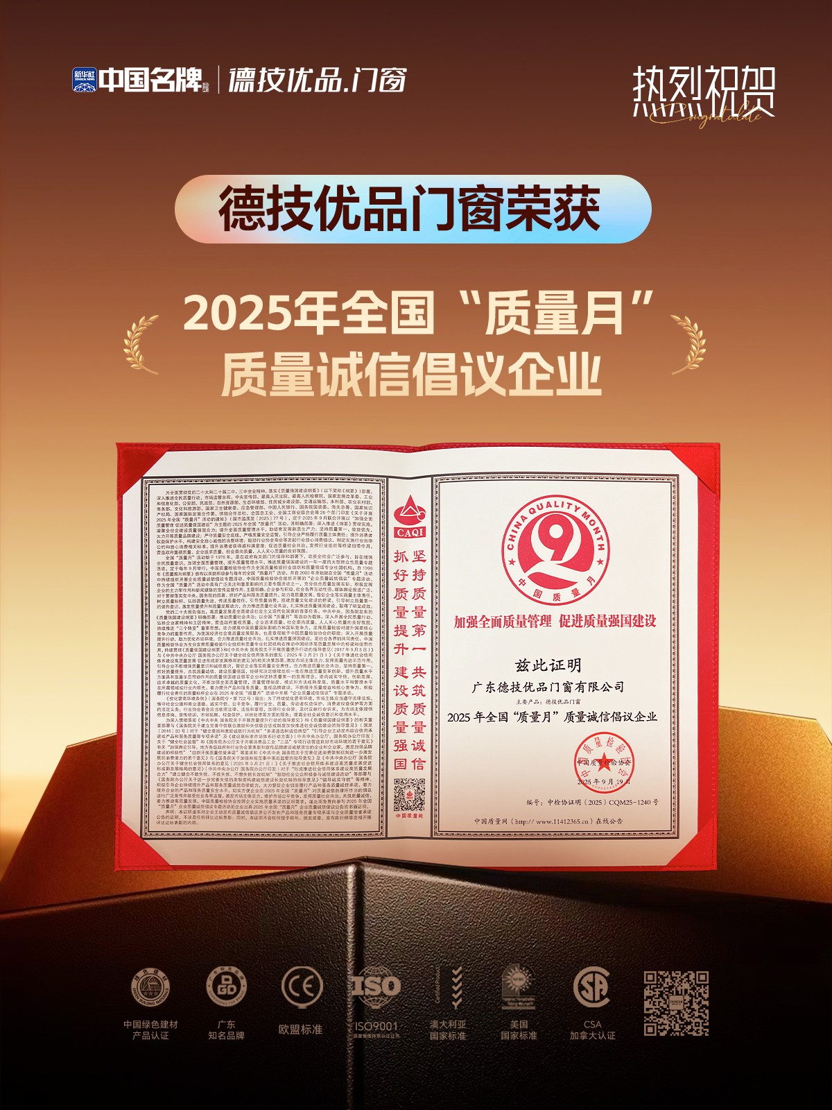 2025年全国质协系统“质量月”权威评选中,深耕安全系统门窗领域的德技优品门窗,凭卓越产品质量与深厚市场口碑,一举斩获“