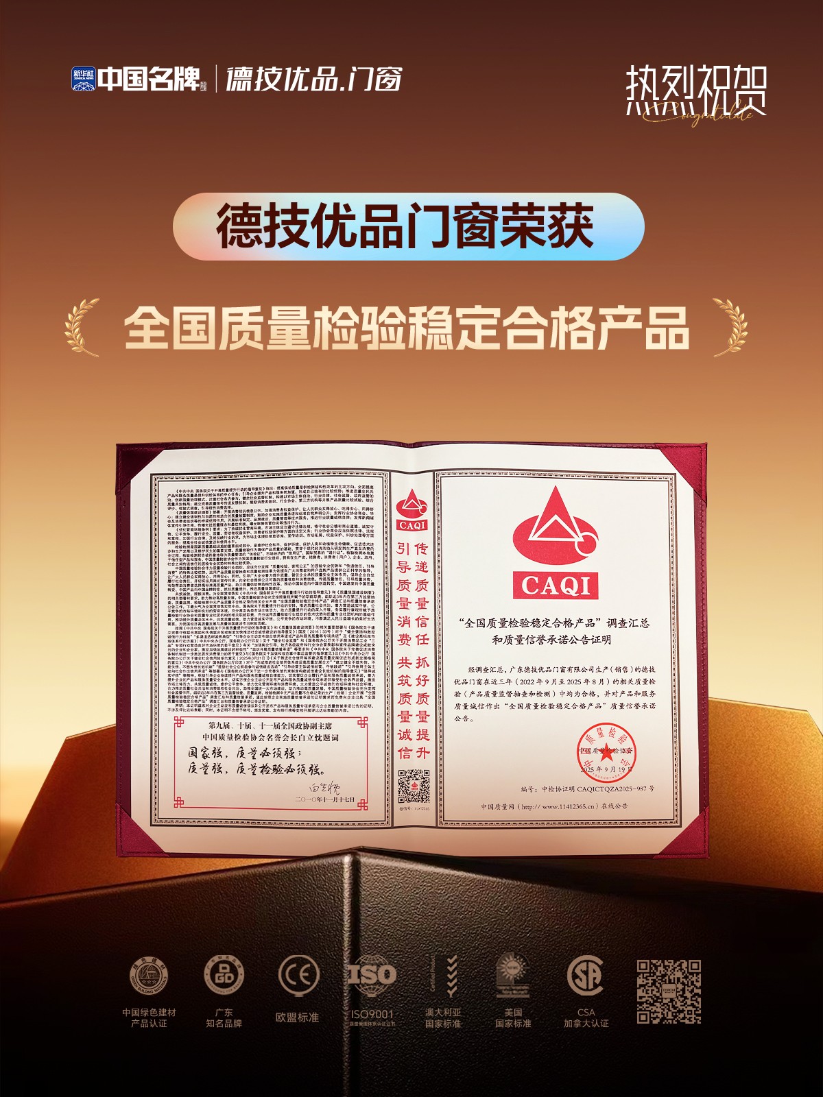 重磅!德技优品门窗斩获六项国家级质量认证,筑牢安全系统门窗品质高地