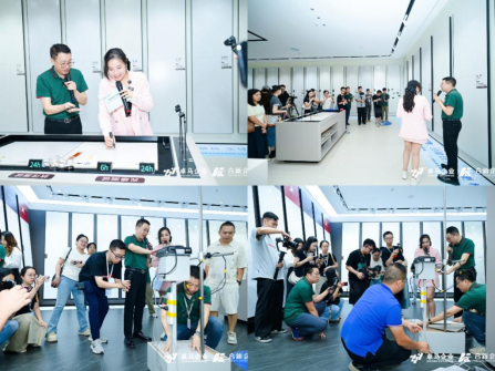 在新品展区,招总重点介绍了“非凡大师·微光丝绒系列”、“非凡大师2.0升级版”以及“瑰丽石5.0”的核心卖点与技术突破;在测评展区,参与光感体验、马克笔抗污、酱油抗污、80cm基础抗冲击乃至极限抗冲击测试,用直观实验验证了产品卓越的防污、抗冲击与耐磨性能。特别是在抗冲击测试环节,随着冲击高度不断加码,见证了产品“以柔克刚”的强韧表现。此外,专业仪器现场检测的平整度数据与耐磨测试演示,进一步夯实了新品在工程应用中的可靠性与耐久性,彰显卓马陶瓷“技术驱动品质”的品牌内核。