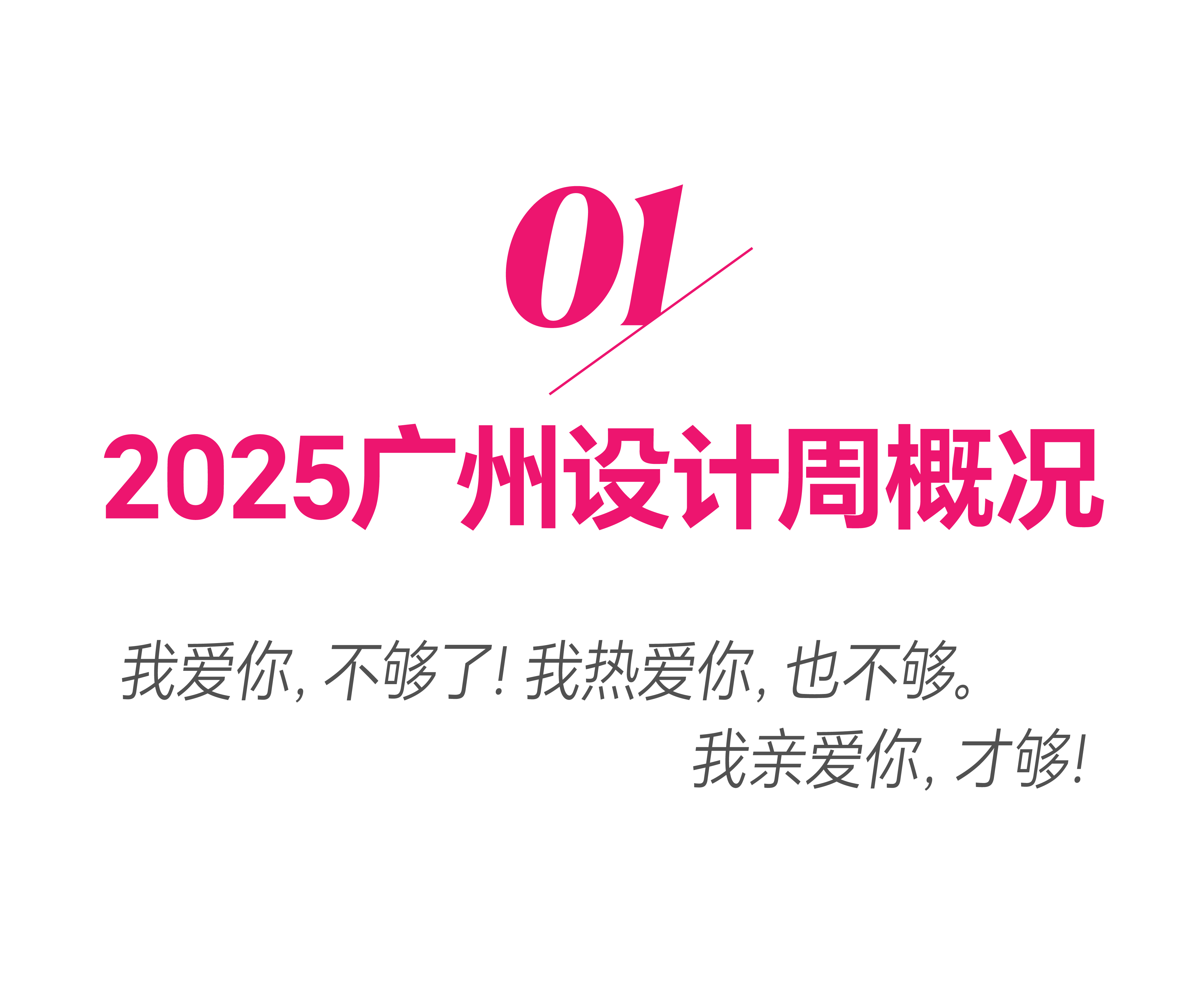 展会主题:亲爱展览时间:2025年12月5-8日展览方向:当代人居生活美学新业态的设计+选材,全案选材全链品类全在广州设计周。展览地点:广州保利世贸博览馆(保利馆)+广州国际采购中心(国采馆)+海珠国际会展中心(海珠馆)观展对象:对设计与选材有商务需求的甲方业主、地产商、设计师、工程商、品牌商、渠道经销商、买手和媒体人等以及海外买家。观展人数:逾45万人次 海量内容:丰富展览:来自全球20+国家逾1000家适于当代人居生活美学新业态的设计/文创/艺术/潮流/家居/软装/高定/智能/材料/户外/生活方式等领域的品牌企业和机构、以及40+超级策展项目联合展出,集中发布新产品、新技术、新趋势。精彩活动:150+场涵盖“居住/新商业/酒店/地产/文旅/设计/艺术/文创/时尚/潮玩/人工智能/生活美学”等方向的主题活动汇聚400+位大咖齐“发声”,指引设计相关产业方向。