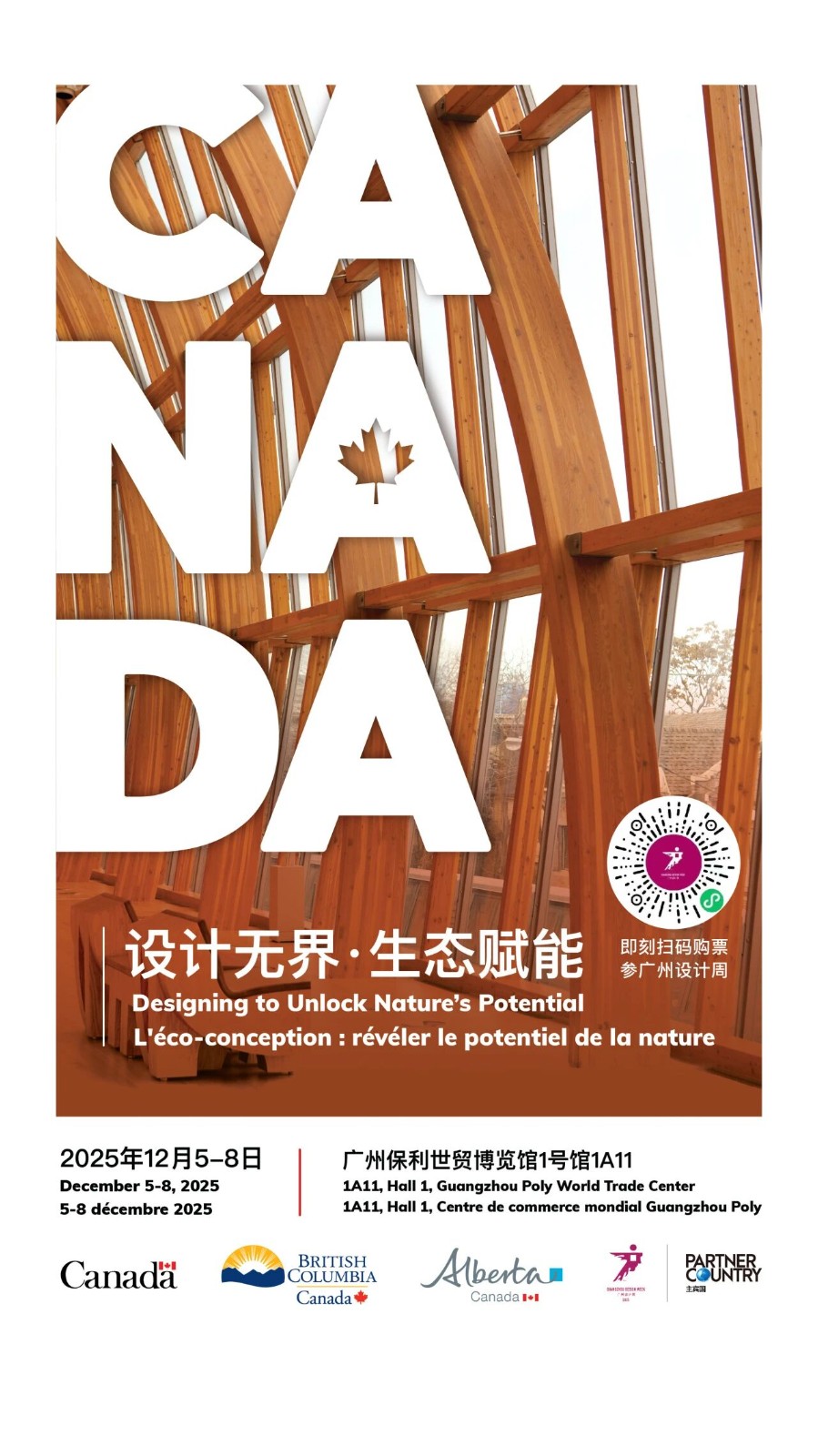 此外,加拿大驻广州总领事馆将携CRAFT安派森、Hi-Velocity加拿大节能公司、Cloverdale科洛德、XYPEX赛柏斯等加拿大家居建材领军品牌和北美先锋设计品牌共同打造“2025广州设计周主宾国——加拿大国家馆”,将聚集木结构建筑、木地板、环保材料、生态空调、创意家具设计等领域,呈现加拿大在设计美学、生态科技与健康生活领域的独特探索,展现“健康生活”与“生态友好”的双重哲学。