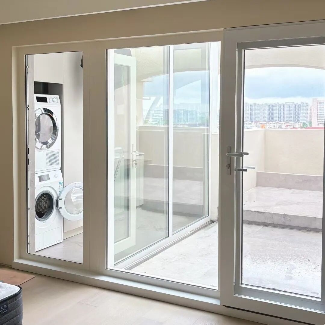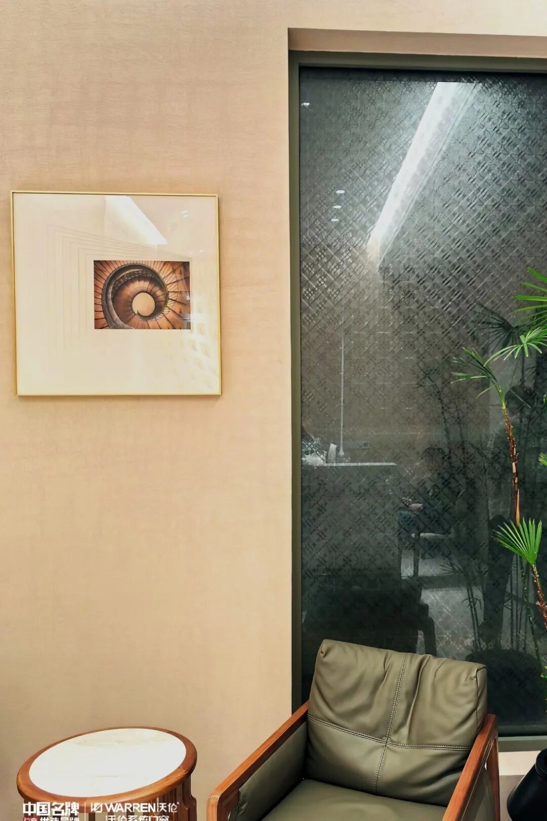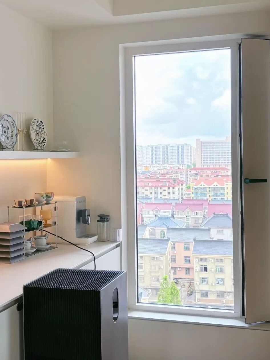 清晨,阳光透过大面积的玻璃铺洒进来,暖白色的窗框将光线柔化,整个客厅都被包裹在暖融融的光晕里,幸福感与安逸感扑面而来。它不仅是一扇门窗,更像是与世隔绝的屏障,将都市喧嚣屏蔽在外,独享一方静谧天地。