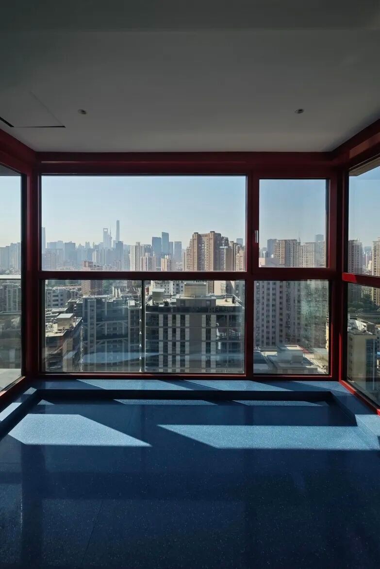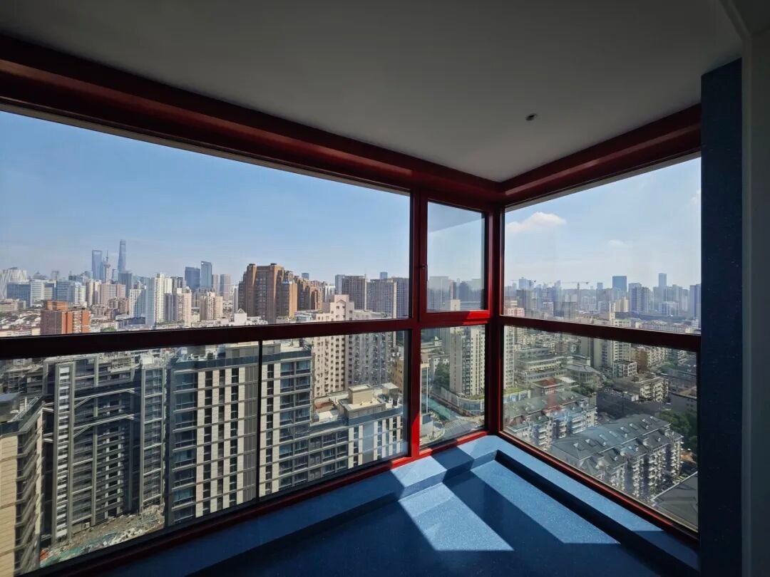 这也是一处位于上海的高层居所,客厅的三面落地窗选择了「沃伦甄选红」,这是经过沃伦精心调整的深红色,饱和度高却不艳俗,带着如同红酒般的内敛与奢华,既有视觉冲击力,又不会过分张扬。