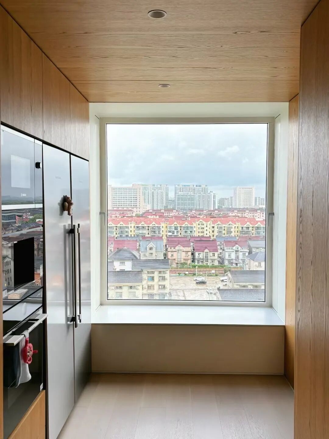 窗框线条极简流畅,不同房间根据功能性分别选择了微通风或内开内倒开启,在保证大视野的同时又保证了通风性,仿佛将整座城市的流动光影都请进了室内。
