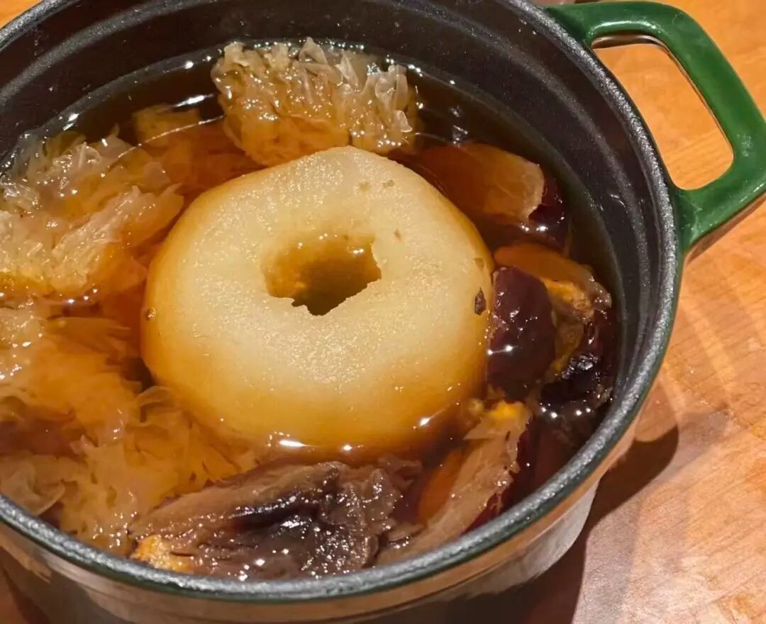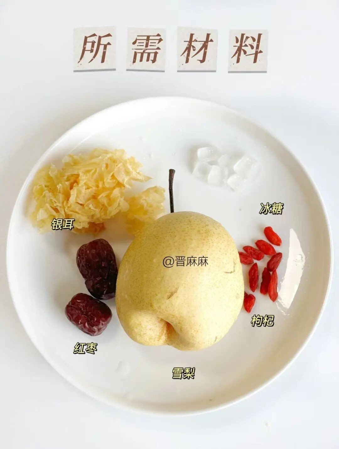 雪梨:1个(选黄皮多汁款,去皮去核切块)· 干银耳:1小朵(提前泡发,撕成小朵去根)· 冰糖:30g(可根据甜度喜好调整)· 红枣:3-4颗(去核切片,增加香气)· 枸杞:1小把(泡发备用,最后5分钟放)· 清水:500ml(或根据喜好调整浓稠度)