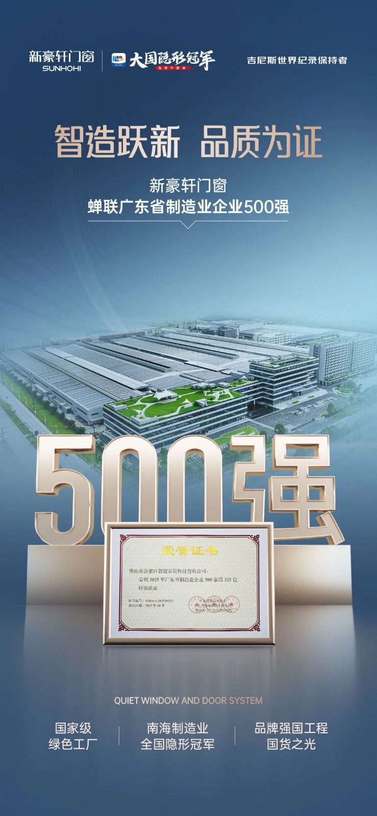 在“制造业当家”的发展格局下,企业坚持高质量发展是根本路径。近日,“2025年广东省制造业企业500强”榜单发布,新豪轩门窗凭借稳健向上的发展和持续的创新力,再度蝉联上榜,2025年位列第325位,凸显了新豪轩强大的智造底蕴和稳固的行业地位。