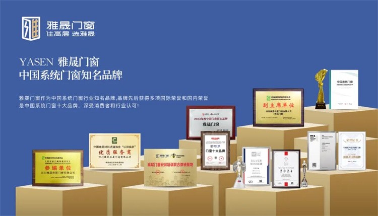 Yasheng Doors and Windows, a well-known Chinese brand of system doors and Windows, specializes in customizing high-end system doors and Windows. Up to now, the industry's first high-rise doors and Windows research center has been established and the "China High-rise Doors and Windows White Paper" has been released. Centering on the brand concept of choosing Yasheng for high-rise buildings, it is committed to providing more systematic doors and Windows solutions for high-rise users. It is also a participating unit in the installation and delivery of aluminum alloy doors and Windows and has been awarded the title of one of the top ten system doors and Windows brands in China.