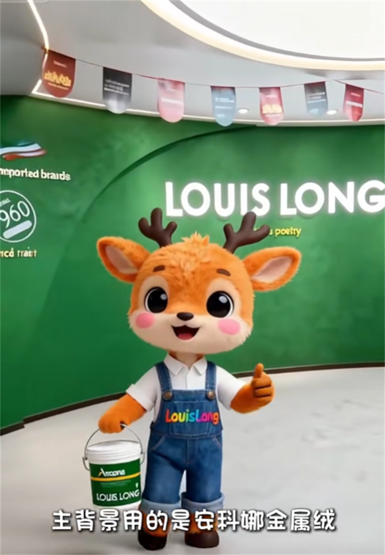 这只圆润可爱的橙色小鹿,是2025路易诗兰品牌专属吉祥物!它身披暖绒软毛,脸颊泛着粉红晕染,圆溜溜的黑眼睛闪烁着好奇与灵动,仿佛藏着无数艺术创意。它身着牛仔背带裤,背带裤的“LOUISLONG”的品牌名与桶身“LOUISLONG”相对应,象征品牌多元色彩体系与艺术涂料的无限创意可能,每一步都踏着灵感的节拍,将自然与艺术的基因注入每一寸空间。