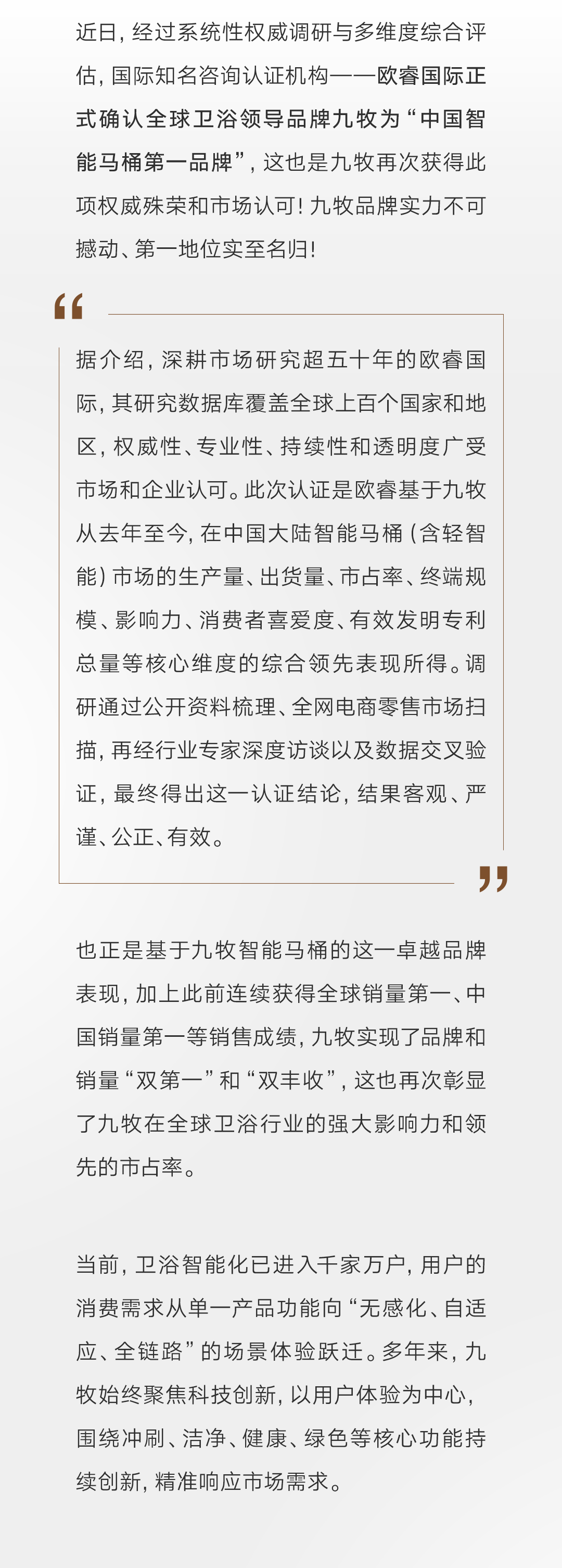 权威认证!九牧再次荣获“中国智能马桶第一品牌”!