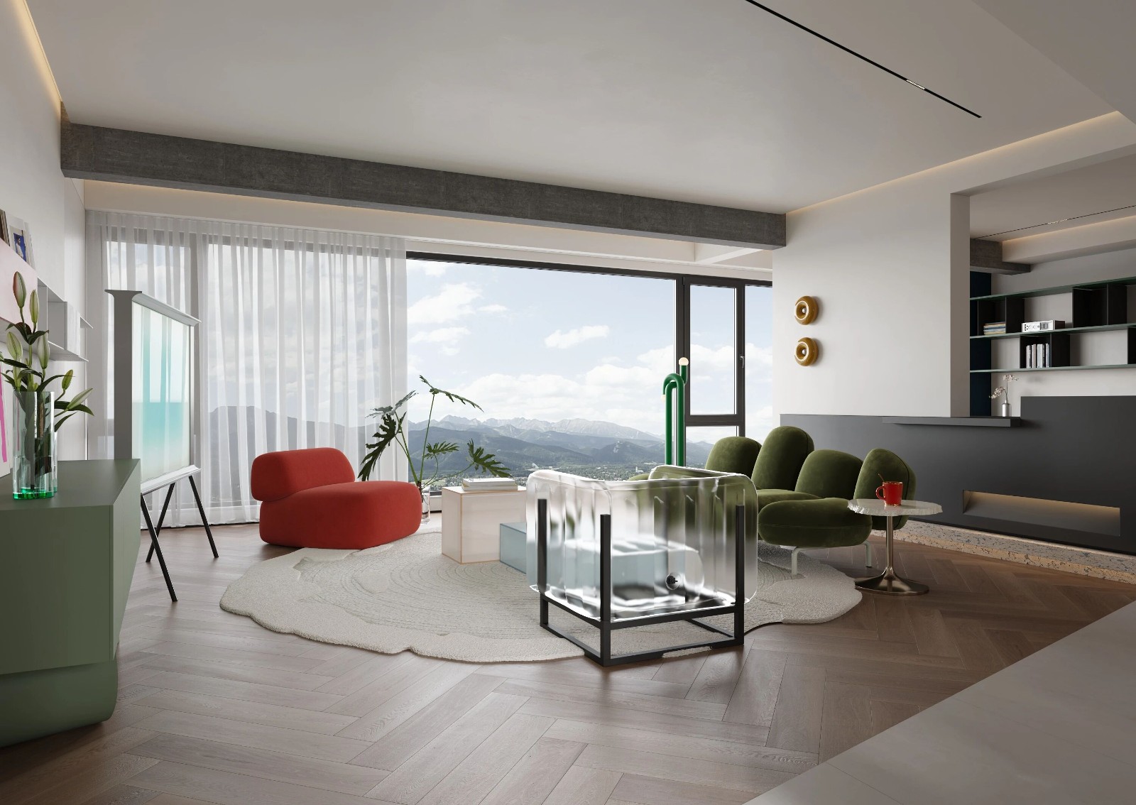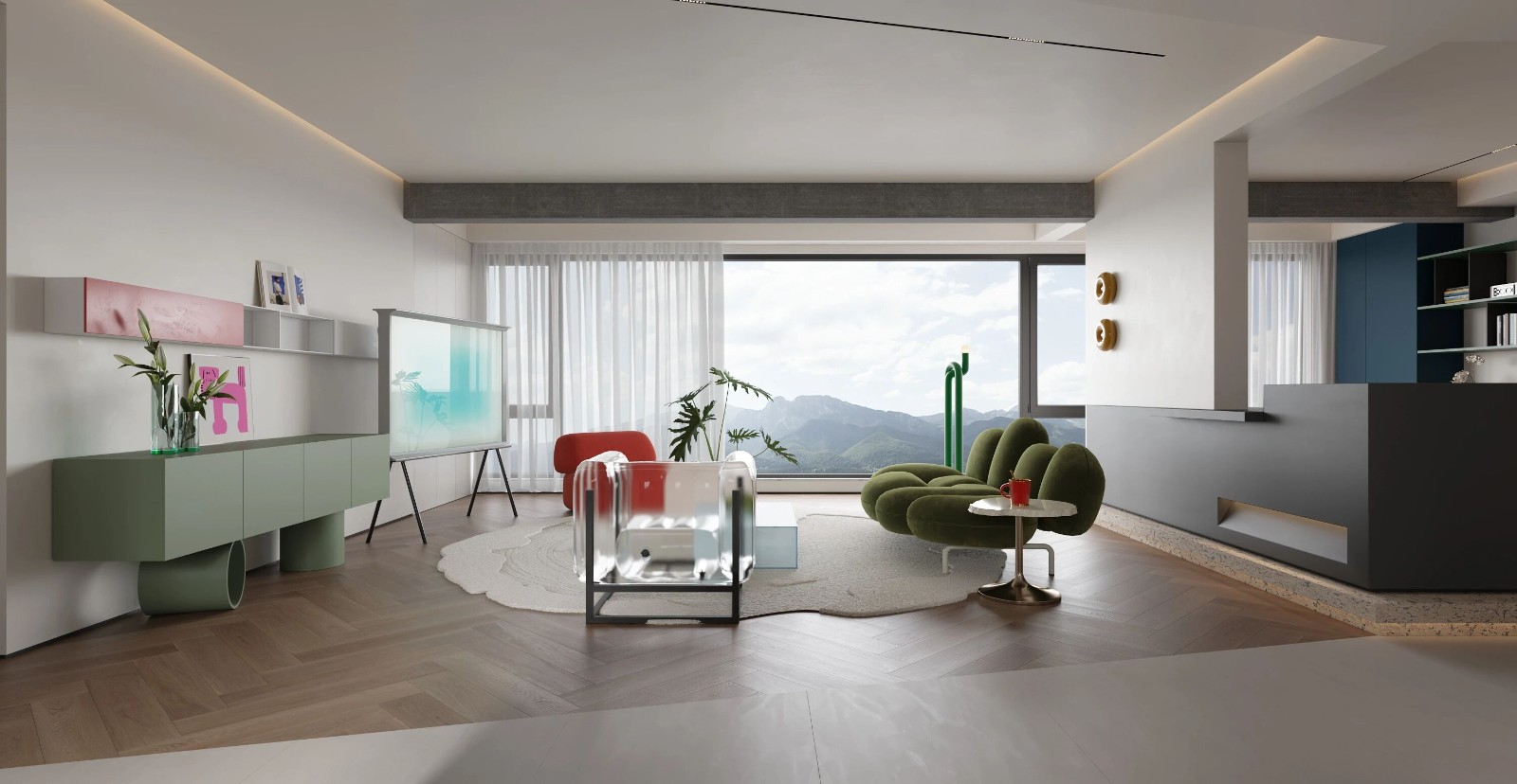 多种色调穿插搭配,尽显温柔惬意,客厅物品硬件色彩设计强调产品调性固有功能性,精致整体提升空间品质感与艺术性,带来更舒适视觉的居家氛围。