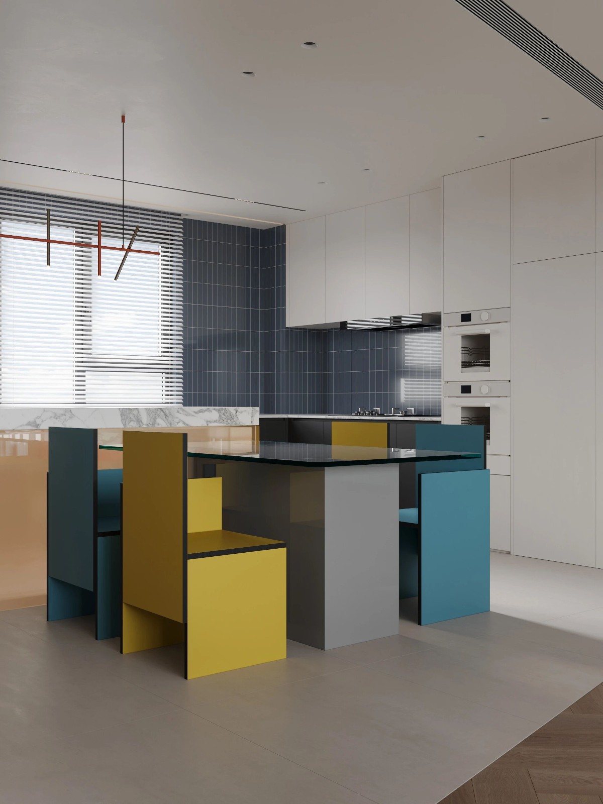 宁静治愈系蓝色的静谧与简约的利落相融合,空间瞬间高级感拉满。无论是墙面的浅蓝,还是软装的深蓝点缀,都营造出一种清新又优雅的氛围。