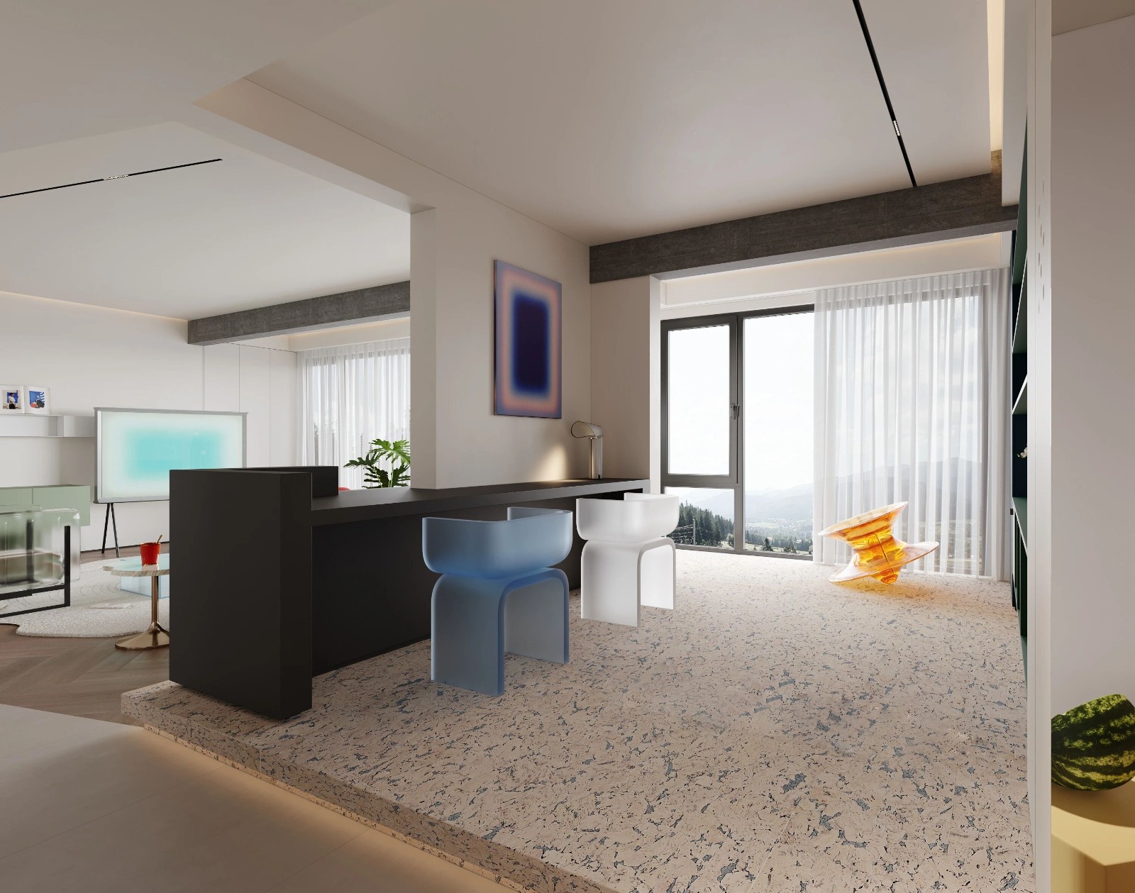 斑驳感的肌理涂料与多种墙面设计,沉稳的质感柔和的色调,营造出极具艺术感的空间氛围。家具错落点缀于开敞格局中,更是赋予了整体空间别样的艺术生命力。