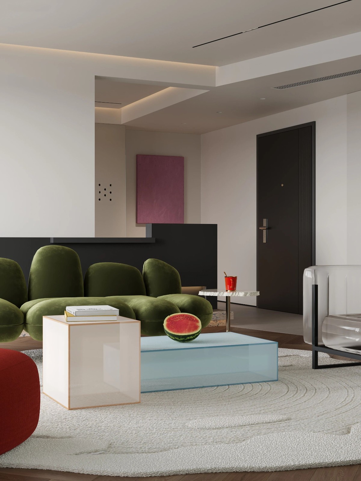 绿色作为主题融入到各个单品角落上,赋予家更多的趣味和生机,摆脱原有精装房轻奢现代的居家氛围~