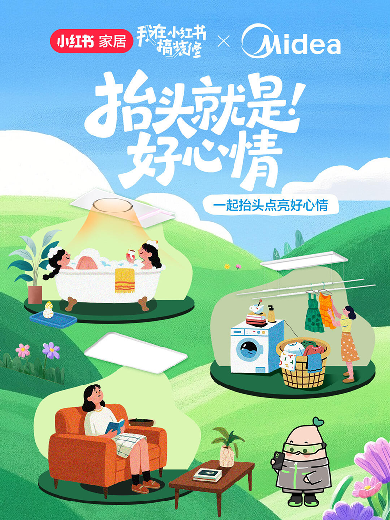 另一边,针对灯饰赛道的传统痛点,美的家居更是率先打破「硬装结束后再选灯具」的装修动线——以往业主往往在装修尾声才仓促挑选吸顶灯,常因尺寸不符、动线冲突或风格割裂留下遗憾。而美的家居选择从装修初期便介入需求场景,以「抬头就有好心情」主题企划跳出传统功能宣讲的窠臼,用「视线向上」的生活哲学重构空间价值,创新性地将浴霸、吸顶灯、超薄晾衣架三款产品串联,打造出「向上生长」的家装解决方案。
