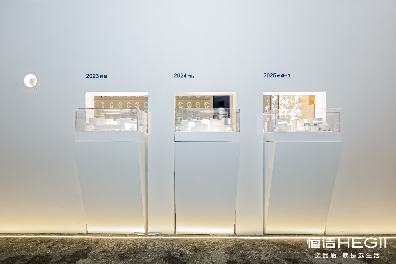 与入口相连的“主题文字介绍墙”,以一条可阅读的“恒洁时光长廊”呈现,让观众在踏入展区的第一刻,就能在品牌的演进脉络中建立关联,对“此间一生”的全新叙事产生更深的理解与共鸣。