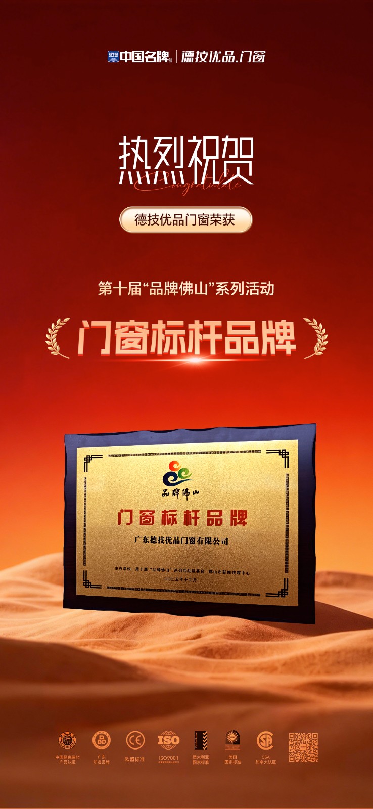 此次荣获“品牌佛山”门窗标杆品牌,既是对德技优品综合实力的权威认可,更是对品牌践行“技术突围+价值竞争”发展路径的肯定。未来,德技优品门窗将继续扎根佛山、放眼全球,以技术创新赋能产品升级,以品质坚守赢得市场信赖,以优质服务传递品牌温度,持续引领安全系统门窗行业高质量发展,让“中国智造”的门窗品牌走向更广阔的世界舞台!