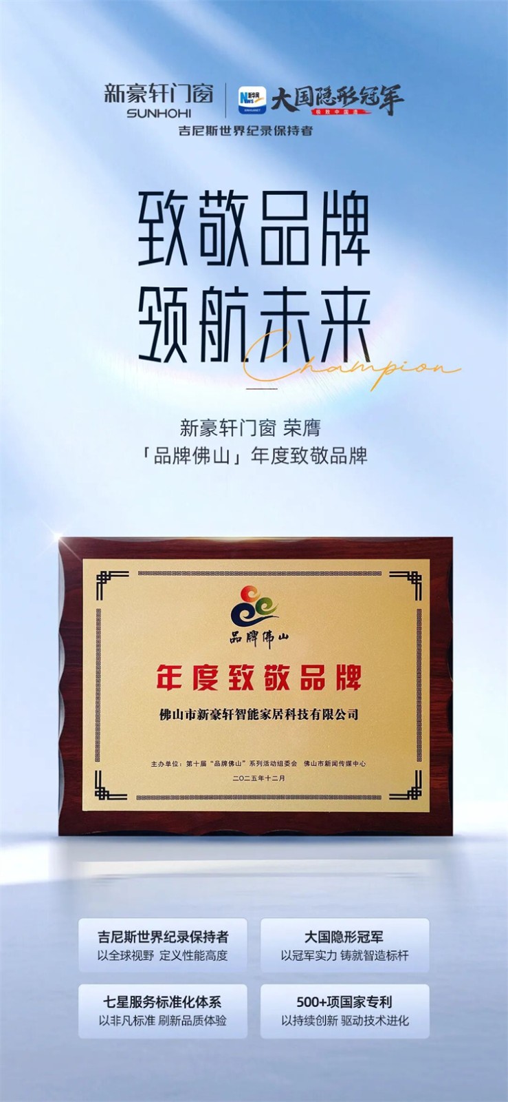 新豪轩门窗在产品品质、服务水平、技术革新、公益践行等维度均树立标杆,构建了行业领先的综合竞争力。此次荣膺“品牌佛山”年度致敬品牌,正是对品牌全域引领价值的高度认可。未来,新豪轩将继续以领航者之姿,推动行业迈向更高质量的发展新程。