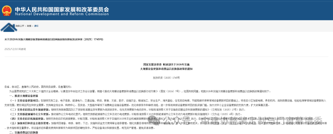 为全面贯彻党的二十大和二十届历次全会精神,认真落实中央经济工作会议部署,根据《推动大规模设备更新和消费品以旧换新行动方案》(国发〔2024〕7号),经国务院同意,国家发展改革委、财政部发布2026年实施大规模设备更新和消费品以旧换新政策通知(下文简称《通知》)。