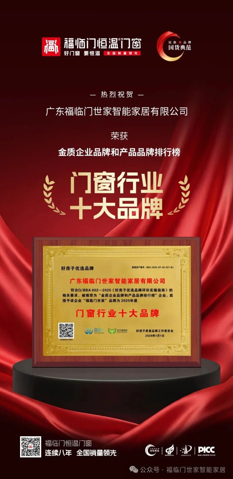 此次荣获门窗行业十大品牌,是福临门世家发展历程中的一个重要里程碑。它标志着福临门世家在品牌建设、产品质量、科技创新等方面取得了显著的成绩,站在了一个新的发展起点上。未来,福临门世家将继续秉承“匠心造福”的理念,如同一位技艺精湛的工匠,用心雕琢每一个产品,不断提升品牌核心竞争力。