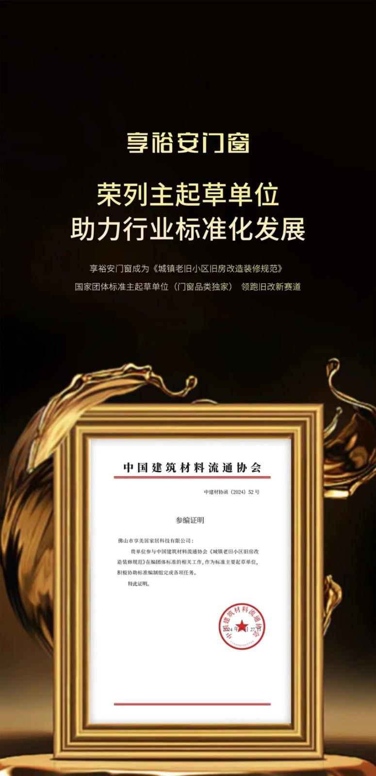作为国家高新技术企业,享裕安门窗已取得多项国家专利技术,并深度参与《城镇老旧小区旧房改造装修规范》团体标准,《系统门窗安装交付标准》(T/GDDWA002—2024),从技术跟随者转变为规则制定者。