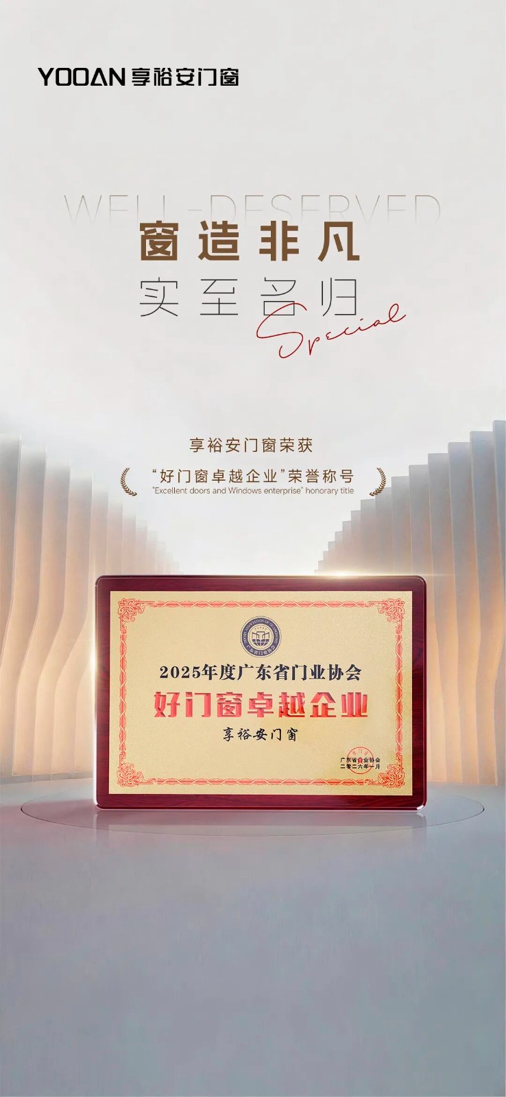 “好门窗卓越企业”这一称号,源自行业、市场与用户的共同认可,标志着享裕安迈入了全新的发展阶段。
