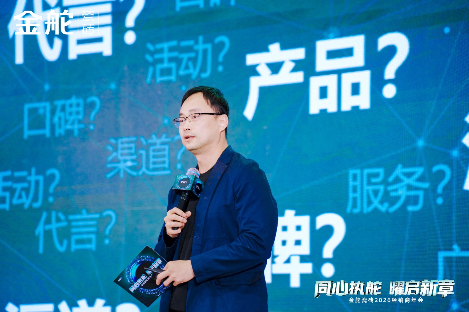 承接品牌价值共识,金舵瓷砖品牌总经理刘显亮携磅礴气势登场,发布主题为《向美绽放》的宣讲。首先带领大家重温“镜界001行动”的辉煌战果。这不仅仅是一次成功的产品推广,更是一次全域营销模式的成功验证。同时,会议上也正式发布2026年以“同心执舵·向美绽放”为主题的营销创新规划,强调多渠道融合共生的新策略。