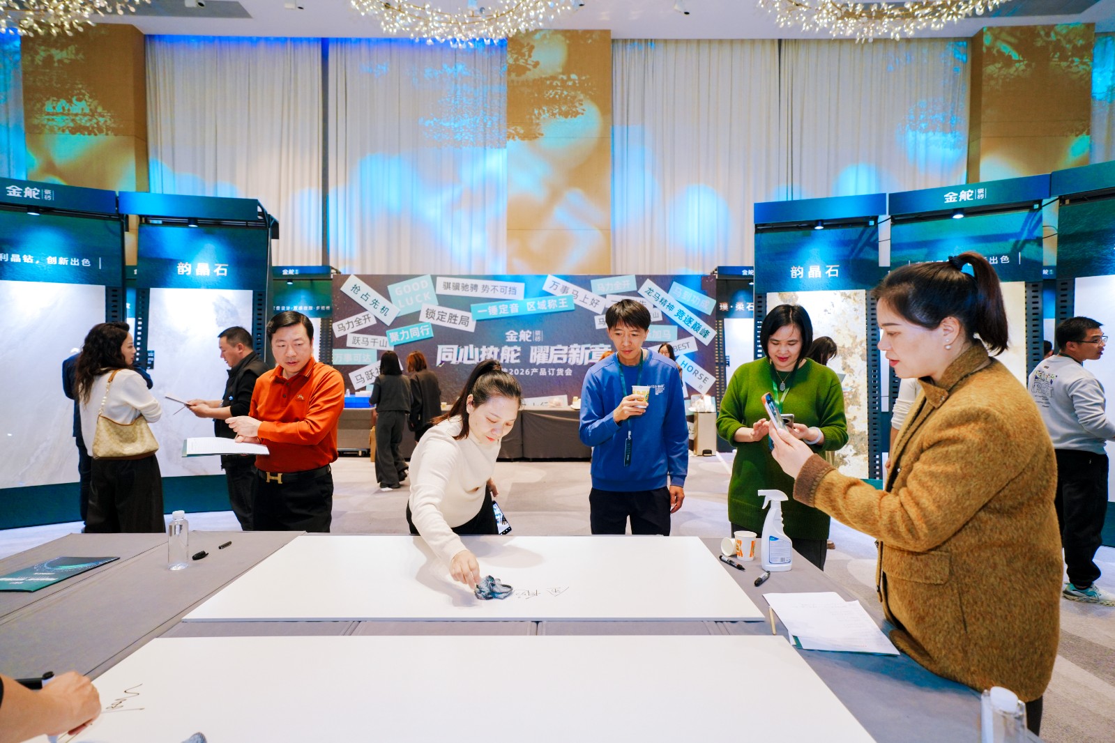 随着新品帷幕的揭开,在现场的产品品鉴区,经销商们近距离感受新品魅力,赞叹之声不绝于耳,纷纷就产品特点、应用前景与市场策略进行交流,对新年度的产品竞争力充满信心。