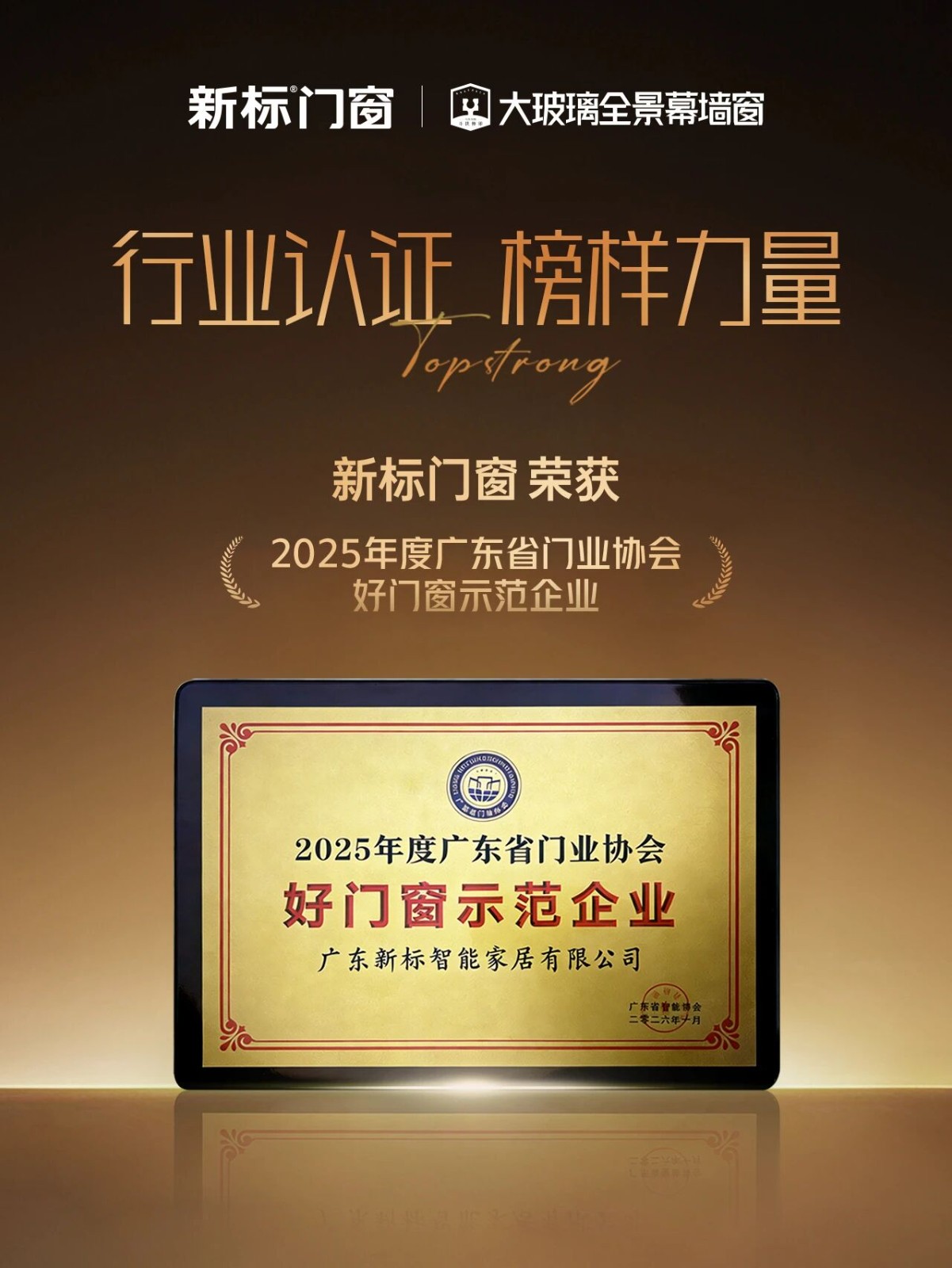 会上,新标门窗凭借在高端系统门窗领域的深耕积淀,荣膺2025年度广东省门业协会「好门窗示范企业」殊荣!这份沉甸甸的荣誉,不仅是行业与市场对新标门窗创新力、产品力、服务力等品牌实力的高度认可,更彰显了新标门窗在行业的领先地位。