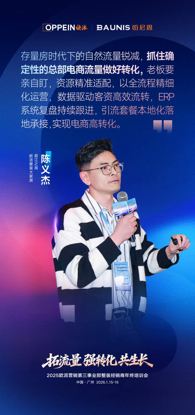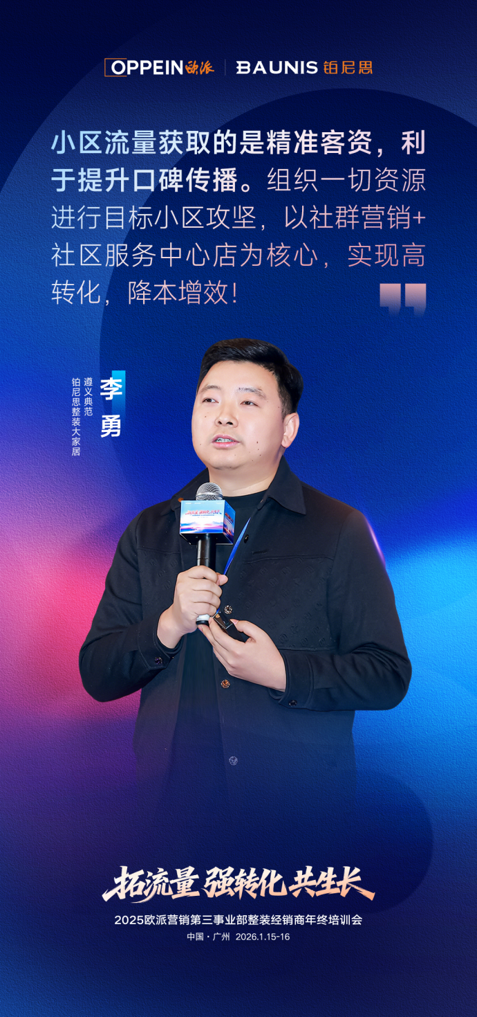 在存量竞争加剧的背景下,系统性的核心能力已成为装企在市场中立足的关键。在本次会上,欧派营销第三事业部从“流量、供应链、运营”三大体系协同发力,构建全维度赋能矩阵,助力装企锻造核心优势,实现转型跃新。