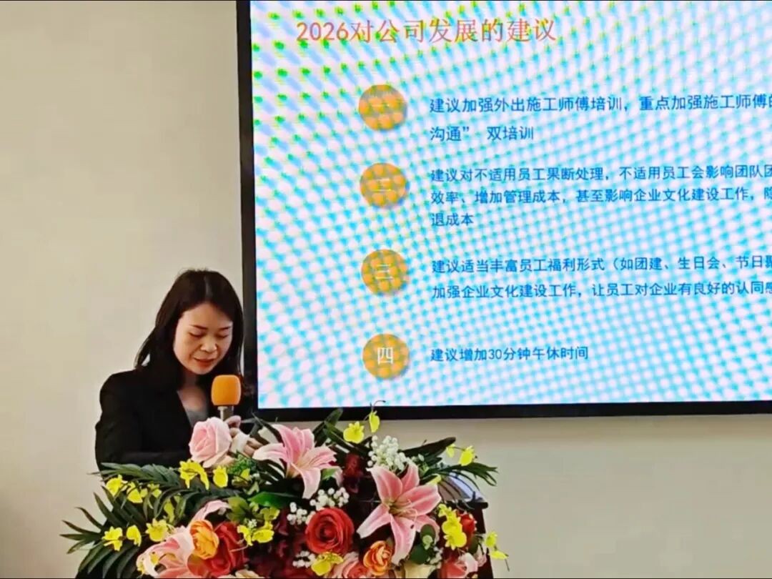 设计部负责人廖健玲首先进行了部门年度总结。她从签单展厅设计、平面设计、品宣等方面取得的成绩数据进行解析。针对2026年的“焕新”主题,设计部制定了明确的工作设计规划。将加强与市场部门的沟通与合作,深入了解客户需求和市场趋势,为产品设计提供更加精准的方向,提高设计师的专业素养和创新能力,为品牌的焕新发展提供有力的设计支持。