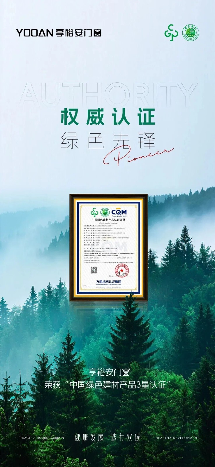 凭借在绿色生产、低碳环保、科技创新等方面投入与严格把控,享裕安门窗先后通过ISO9001质量管理认证、ISO14001环境管理体系认证、ISO45001职业健康安全管理体系认证。并且通过高水平的标准引领、高品质的环保生产、高效能的技术支持,一举获得“中国绿色建材产品认证”、“家居绿色环保领跑品牌”,以实际行动争当行业绿色健康发展领跑者。