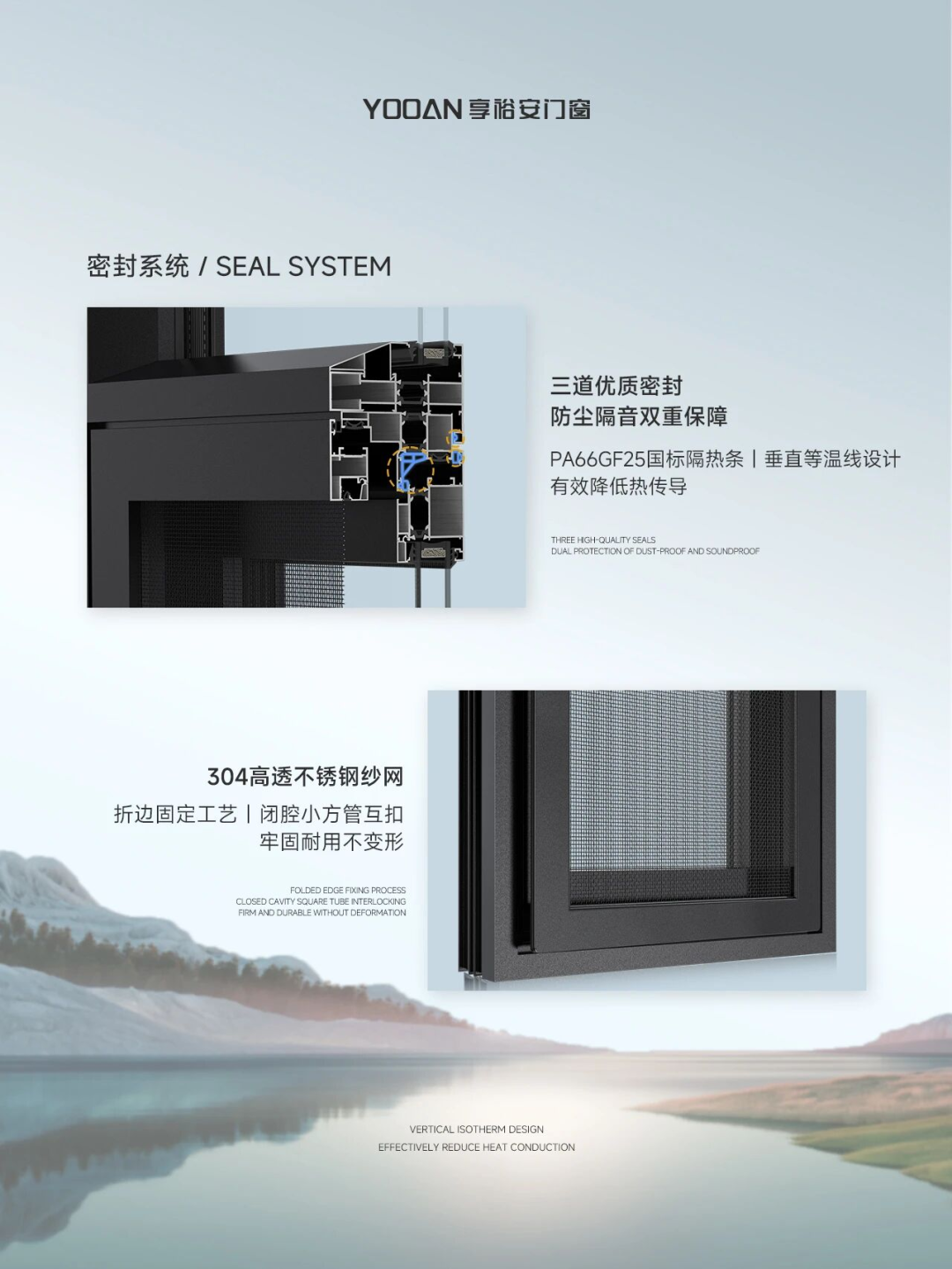 其潜心研发YOYO阳光V12断桥外平开窗,突破性的密封设计,超强的防水性能,广受消费者喜爱。双钢化中空隔音安全玻璃,隔音降噪,缔造品质生活新“静”界;垂直等温线设计,降低热传导,宽边鸭嘴半胶密封,稳定性强,紧实耐用,三道密封设计,搭配整框无缝焊接工艺,严密防风防水,以超强密封性能,能有效地阻隔灰尘,病菌等污染物质。让家居生活更安心,舒适。