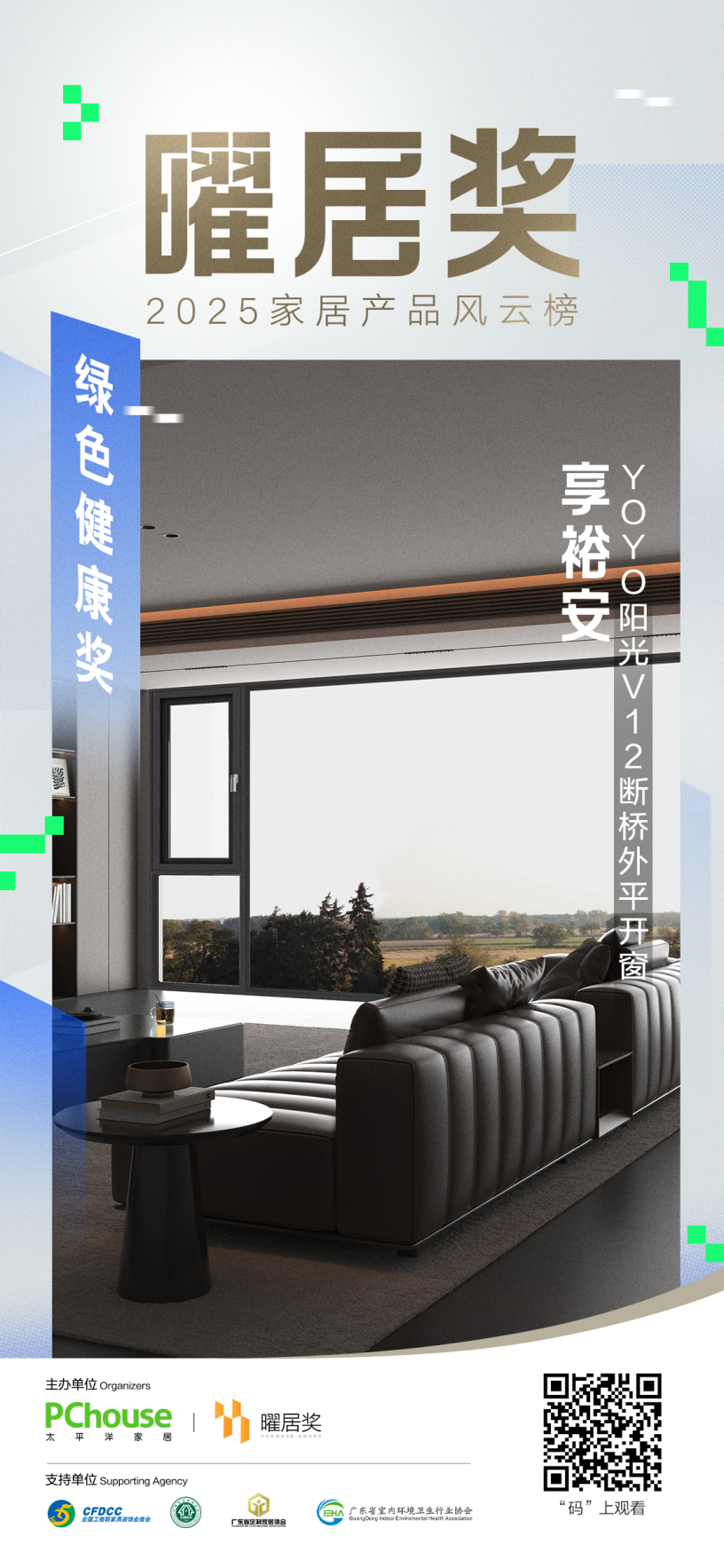 近日,由PChouse太平洋家居网联合国内外领先的检测机构、行业专家和协会组织,并携手设计领域知名设计师共同发起年度家居优品评选活动——PChouse家居产品风云榜「曜居奖」重磅揭晓,享裕安门窗凭借卓越的的产品品质、环保性能与健康理念,荣膺“绿色健康奖”,这一荣誉不仅是对品牌技术实力的认可,更是对其守护家庭健康生活承诺的有力印证。
