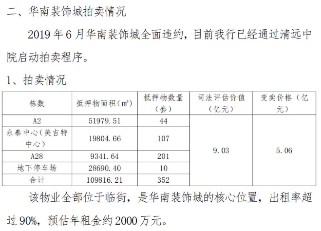 根据广东省清远市中级人民法院发布的拍卖公告,该标的物的评估价值约为8.15亿元,而起拍价定为5.71亿元,相当于评估价的七折。尽管价格已有大幅折让,且标的物本身具备明显的区位与经营优势——作为清远市规模最大且唯一的专业建材家具市场核心部分,其出租率超过90%,预估年租金可达约2000万元,周边交通网络发达,已形成成熟的商贸产业集群——但仍未能在规定的竞价周期内吸引到任何一位竞买人报名出价。