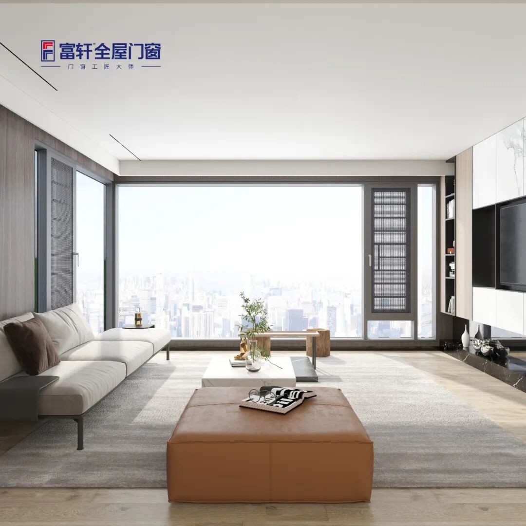 富轩全屋门窗标配超白玻璃,让每一扇窗都轻松拥有精致透亮的颜值,91.5%高透光率,窗外山水尽揽入生活空间,客厅时刻保持明亮宽敞;配合富美V2双内开窗,窗扇与窗纱向内开启,日常通风畅通无阻,窗纱一体的设计更有效阻挡蚊虫入室,让客厅始终保持通透洁净。